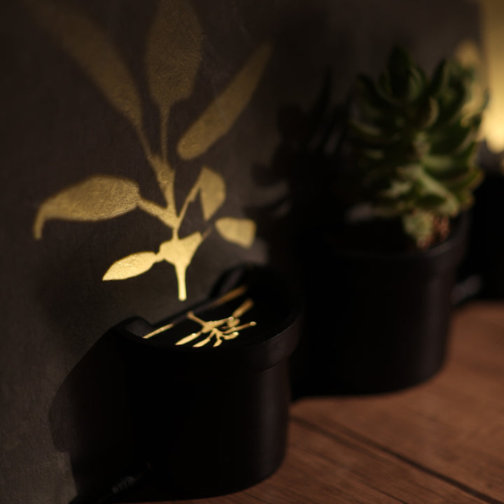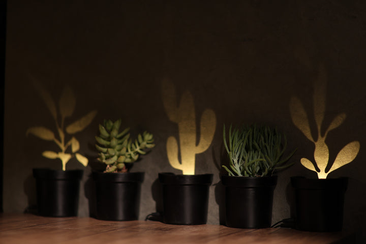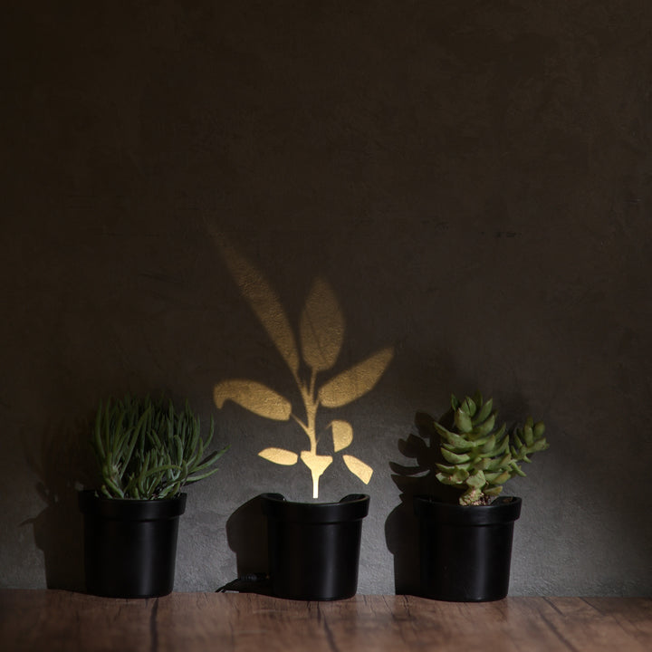 The Light up Plant, a mini pot that transforms into a stunning decorative piece when switched on. Featuring three unique plant shapes, this 10 cm pot expands to 30 cm when powered on, casting beautiful plant shades on the wall. Its ideal for placement next to plants for a charming decorative effect.